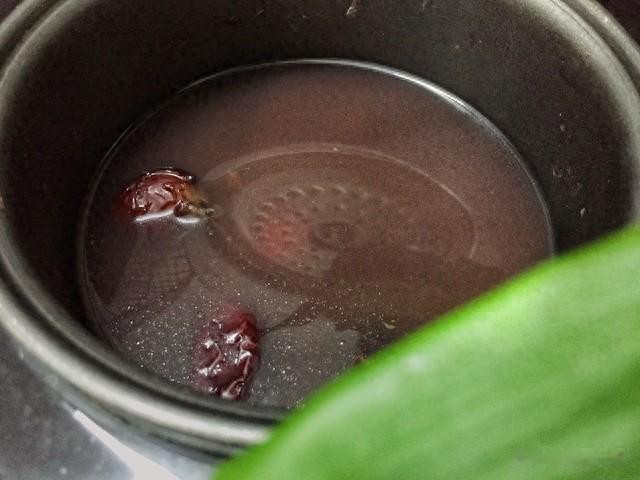 作念法:用簇新山楂10颗(去核)简略干山楂片也行,加上5颗去核的红枣。一谈放进锅里,加700毫升水。烧开后,小火慢炖20分钟。以为太酸不错加一小块冰糖。煮出来的汤水红彤彤的,饭后喝上一小碗,清亮又自得。