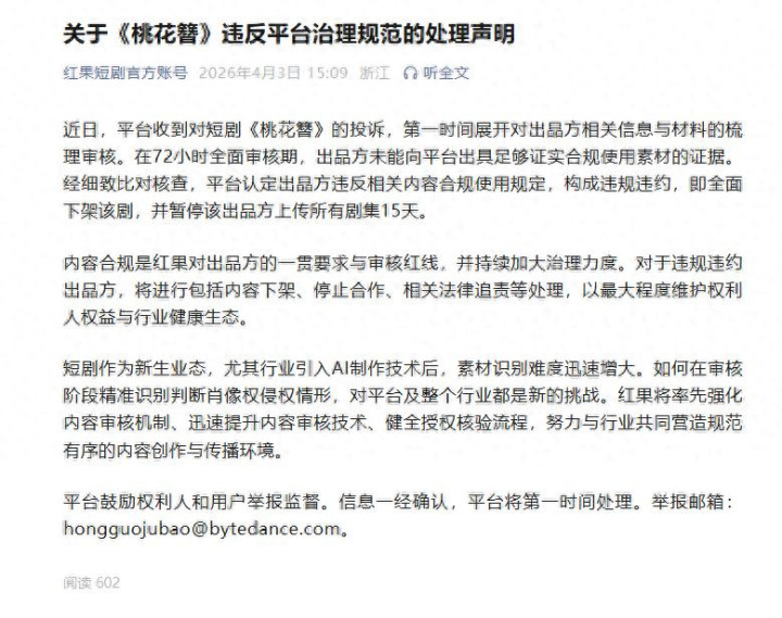 4月3日,红果短剧官方发布处理声明,证实此前激励热议的AI短剧《桃花簪》因违抗平台处罚行为已被全面下架,涉事出品方同期被暂停上传整个剧集15天。