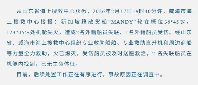 从山东省海上搜救中心获悉,2026年2月17日19时40分许,威海市海上搜救中心接报:新加坡籍散货船“MANDY”轮在概位36°45′N,123°05′E处机舱火灾,变成2名外籍船员失联、1名外籍船员受伤。经山东省、威海市海上搜救中心组织专科挽救船舶、专科挽救直升机和左近商船等力量全力挽救,开云体育官方网站火已灭火,受伤船员被实时送医救治,2名失联船员在机舱内找到,已无生命体征。